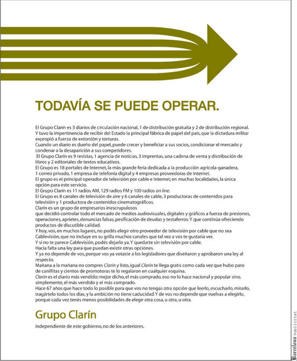 Clarín es un grupo de empresarios inescrupulosos que decidió controlar todo el mercado de medios audiovisuales, digitales y gráficos a fuerza de presiones, operaciones, aprietes, denuncias falsas, pesificación de deudas y testaferros. Y que continúa ofreciendo productos por discutible cantidad.